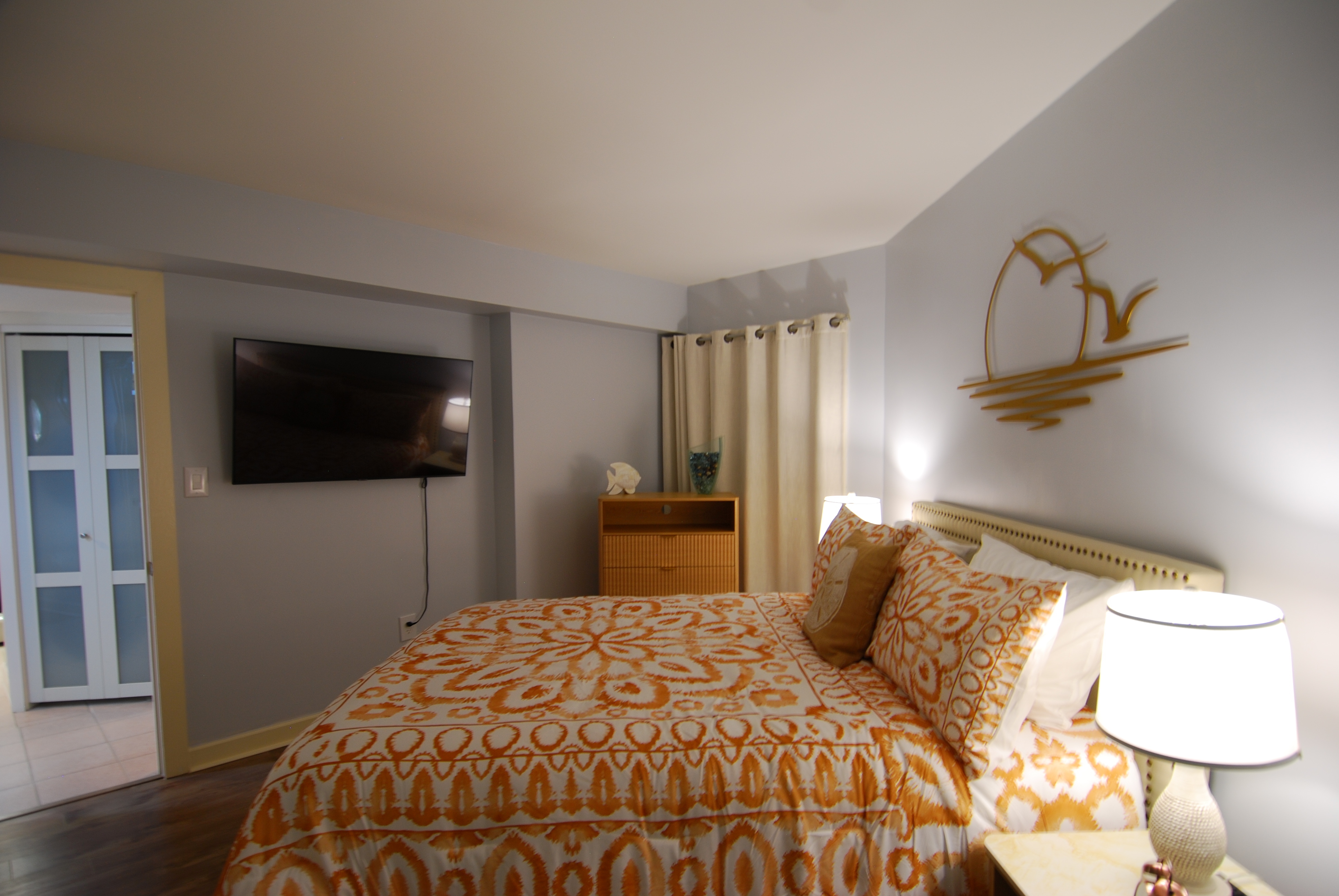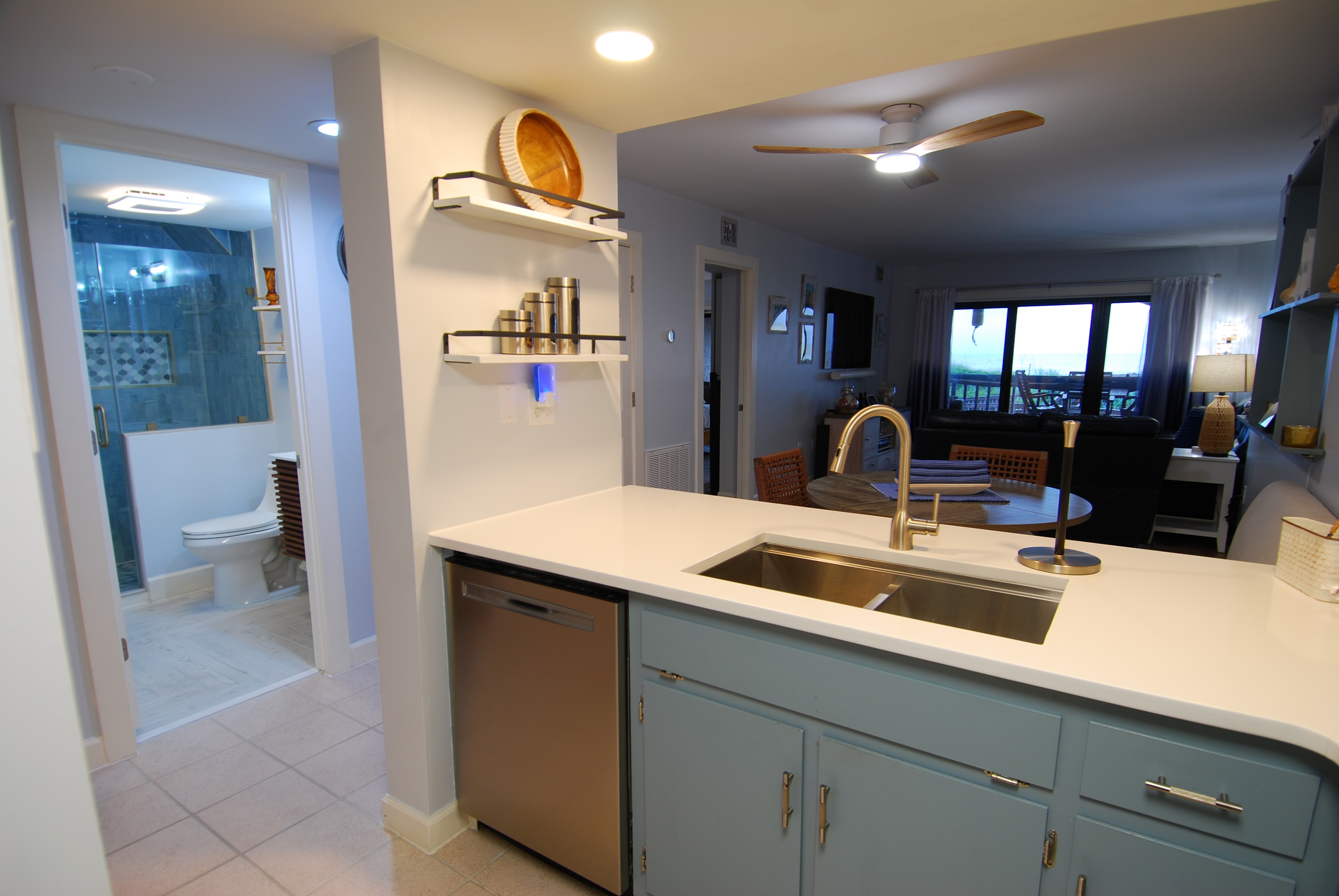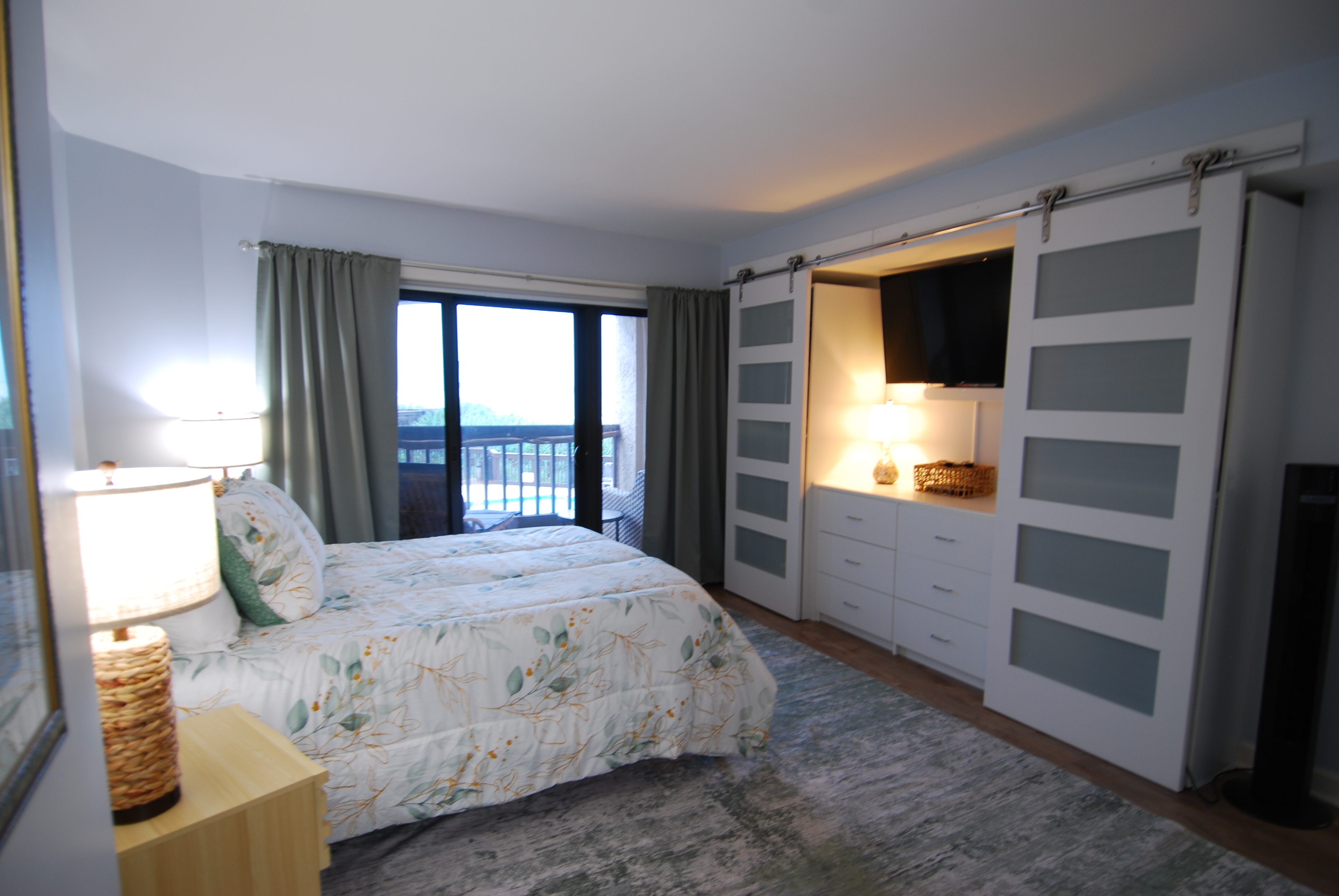 This condo on the first floor has recently been completely remodeled. This condo is equipped with an adjustable Queen bed in the main bedroom and a Queen in the second bedroom. The living room has a 65" TV and a sofa with recliners on both ends. Both bedrooms are nicely equipped with 50" televisions. This unit has 2 walk-in showers. There is no tub in this unit.