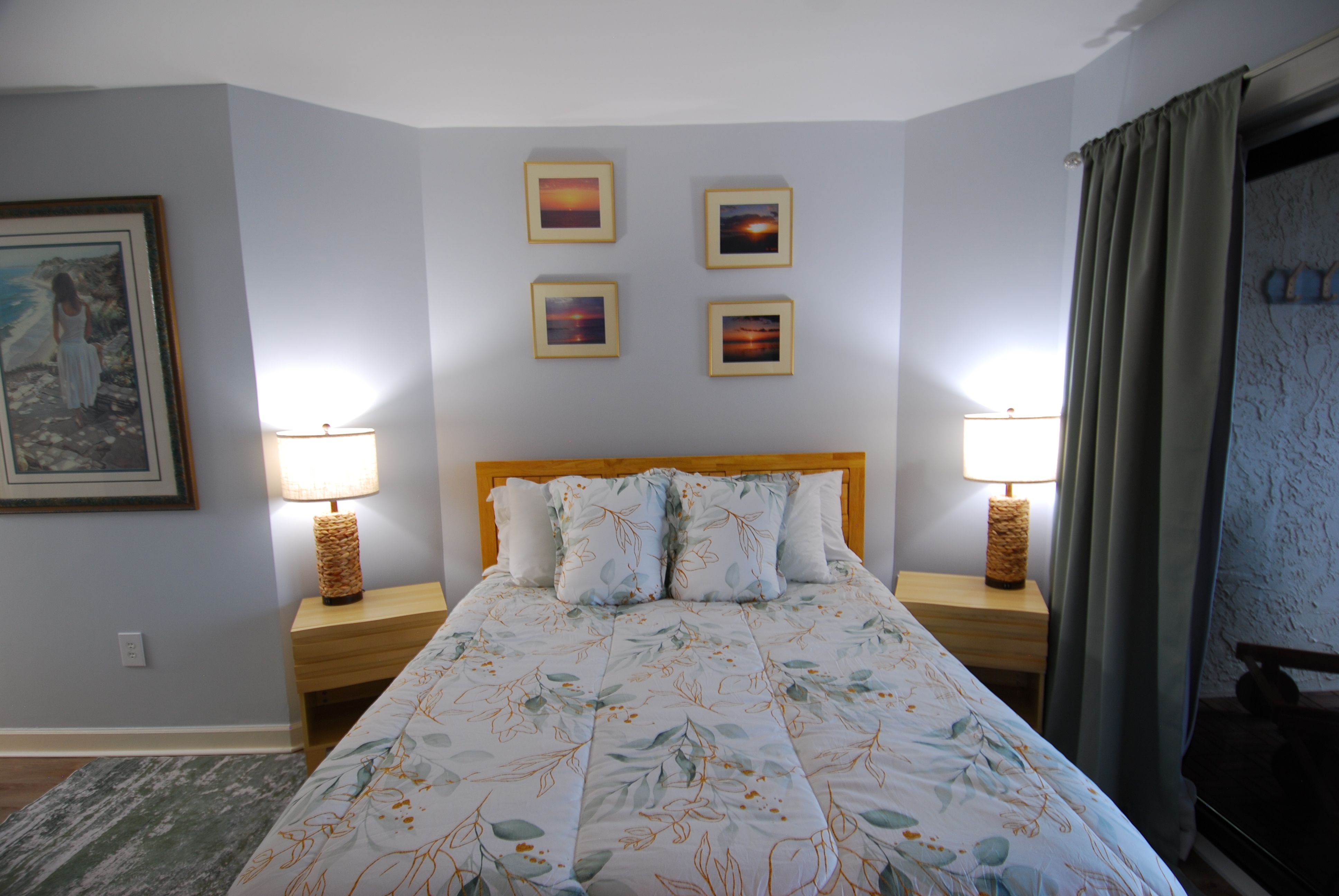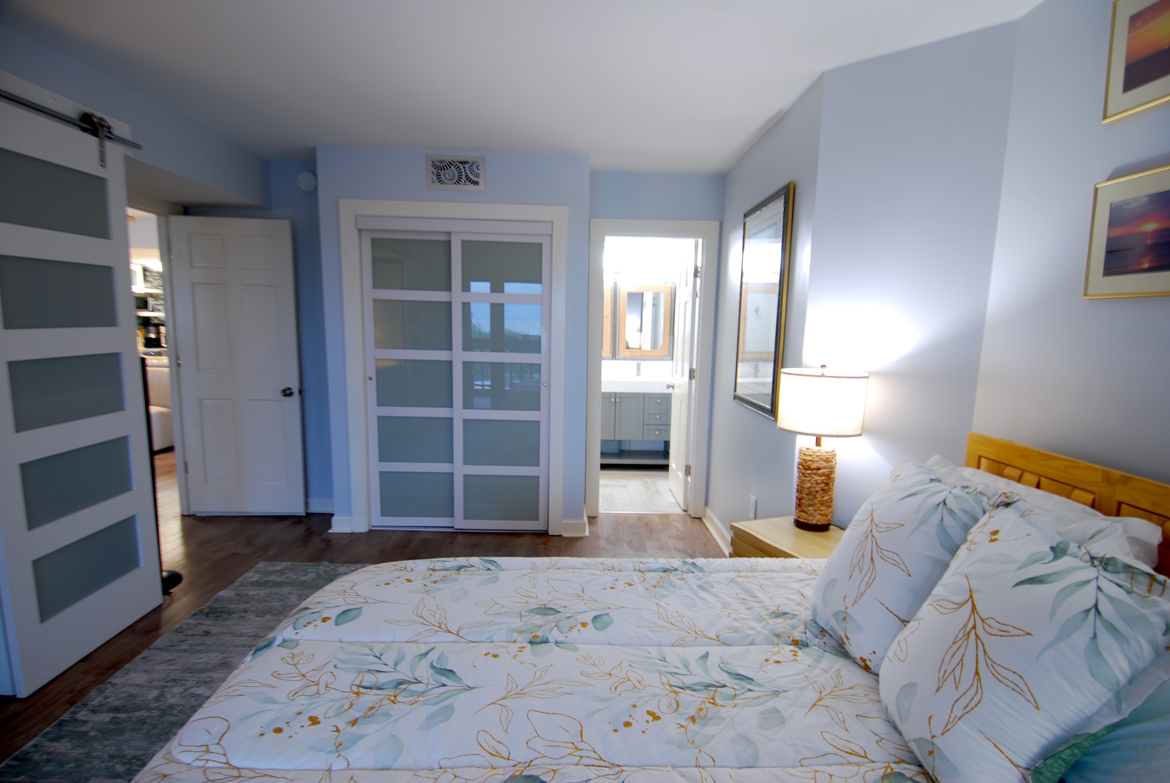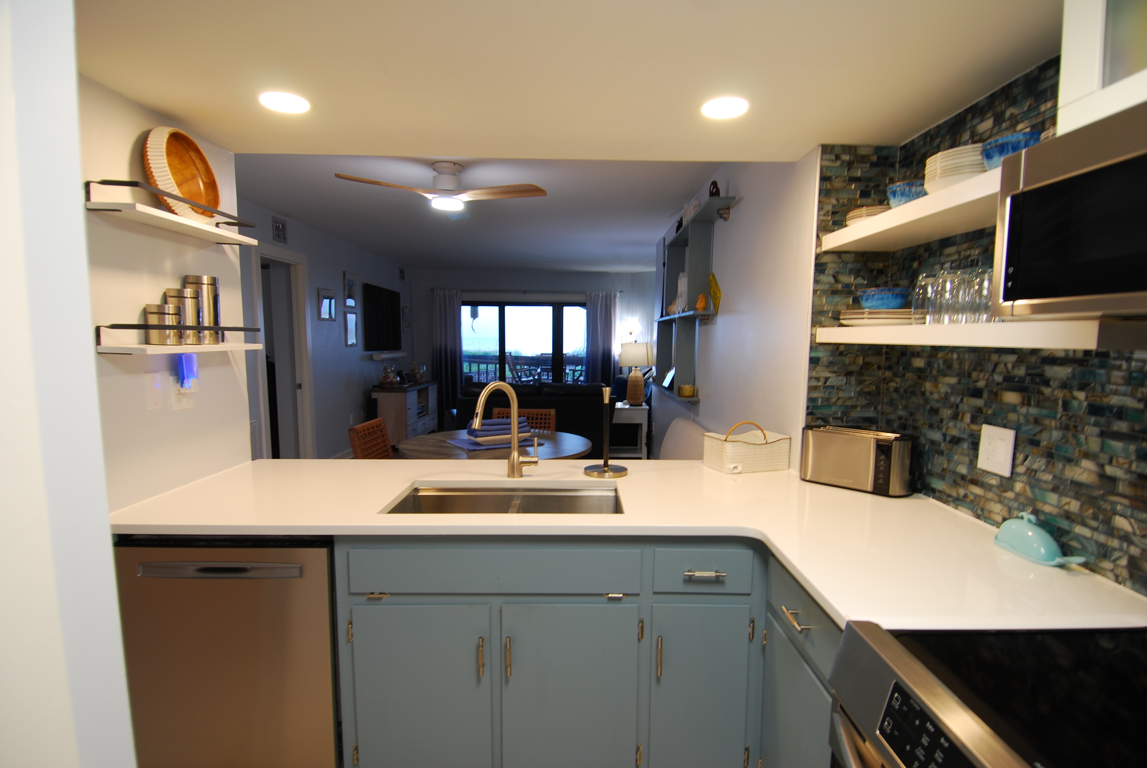 This condo on the first floor has recently been completely remodeled. This condo is equipped with an adjustable Queen bed in the main bedroom and a Queen in the second bedroom. The living room has a 65" TV and a sofa with recliners on both ends. Both bedrooms are nicely equipped with 50" televisions. This unit has 2 walk-in showers. There is no tub in this unit.